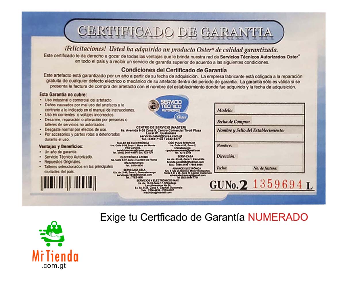 Pregunta de clientes. ¿Porqué en redes las venden a mitad de precio? Son imitaciones, la clave está en que no le ofrecen Certificado de Garantía Numerado de Oster®. Asegura tu inversión solicitando el certificado de garantía de 1 año.